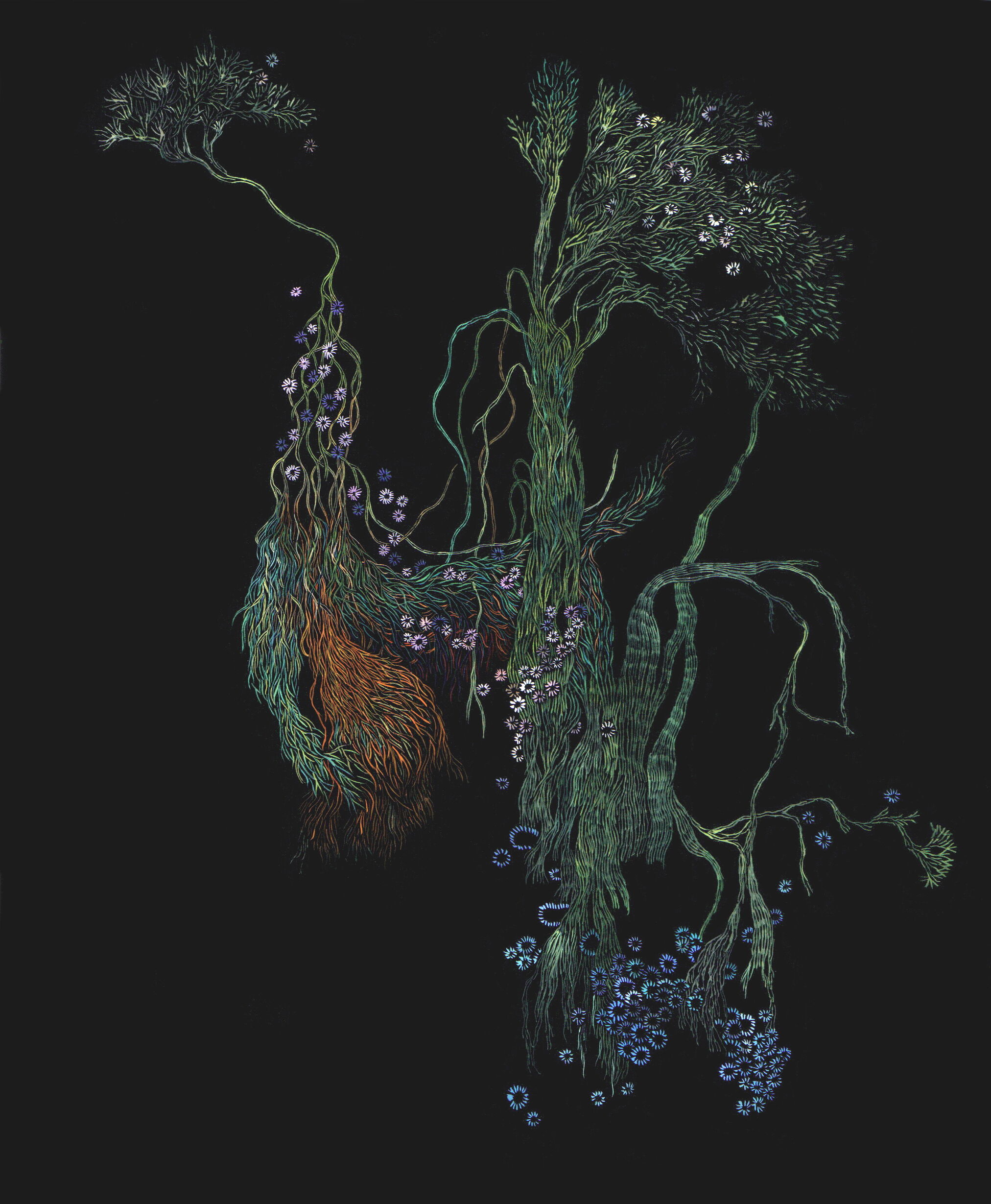 En 2018, la Galerie d’art présentait les dessins à quatre mains et en noir et blanc de Belem Julien et Mathieu Schmitt. L’exposition Noctambuler fait apparaître le chemin parcouru en six ans à travers l’entrée dans une nouvelle dimension : la couleur. Le geste se libère, tisse des flux et dénoue des écheveaux pour déployer des paysages imaginaires.