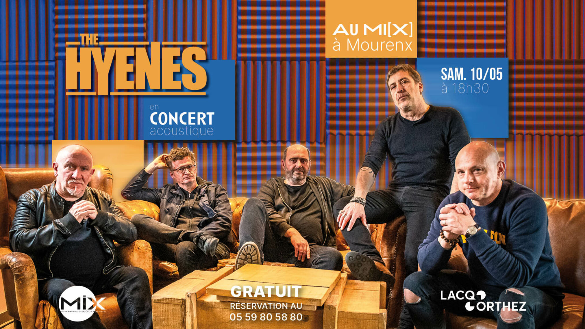On ne présente plus The Hyènes. Depuis leur rencontre en 2006 avec Albert Dupontel pour composer la BO du film « Enfermés dehors », ils n’ont jamais posé leurs valises. Le projet musical devait en rester là. Pourtant, à la suite de la sortie du film, Denis Barthe commence à recevoir des propositions de concerts. En plus de leur version branchée, ils proposent une version « unplugged ». Un Line-Up débranché : Vincent Bosler (chant guitare), Denis Barthe (Tipi Drum, choeurs, ex Noir Désir), Olivier Mathios (basse choeurs), Luc Robène (guitare choeurs, ex Noir Désir) et Guillaume Schmidt (saxophone et Fender Rhodes).