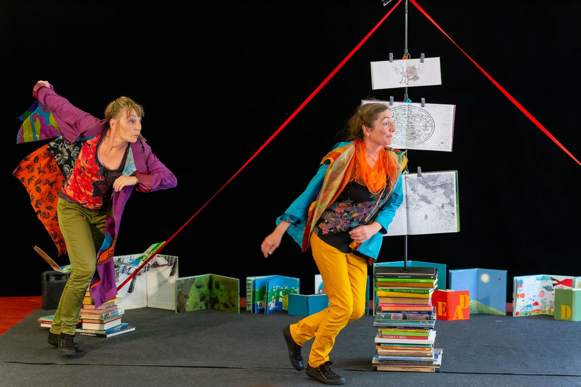 Une pile de livres et deux personnages intrépides qui s’aventurent sur ce terrain de jeu. Rapidement, ils nous entraînent dans un marabout-bout de ficelle de situations drôles