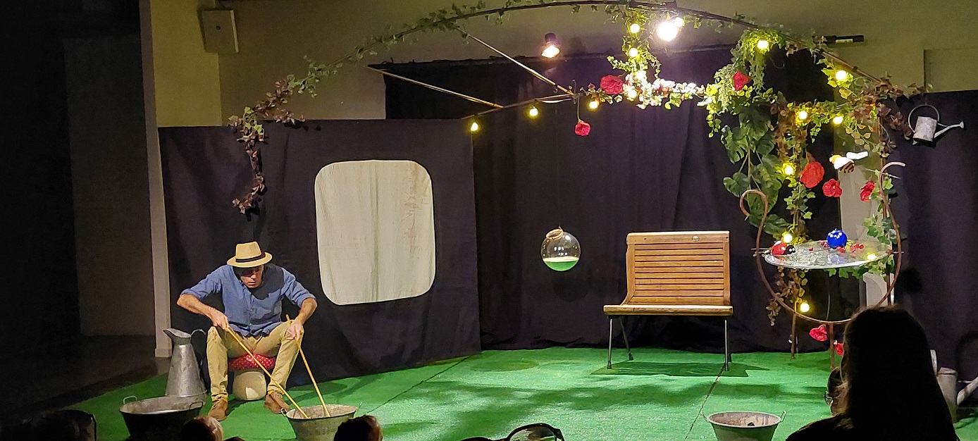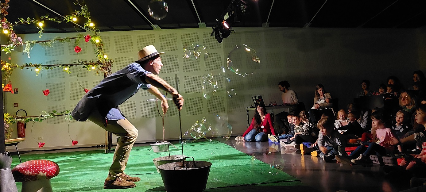 Un kiosque sous les lampions. Après l’orage, sous le bruit d’une douce pluie d’été, un drôle de bonhomme jongle avec des balles, des bulles et des histoires de petites bêtes... histoire de faire éclore les coquelicots. Dans ce cocon de verdure, ce bon- homme joue de poésie et de magie. Il nous invite à observer, rêver, ima- giner. Et peu importe qu’on ait 100 ans ou 4 ans, il est toujours temps de regarder le monde au travers des bulles de savon !